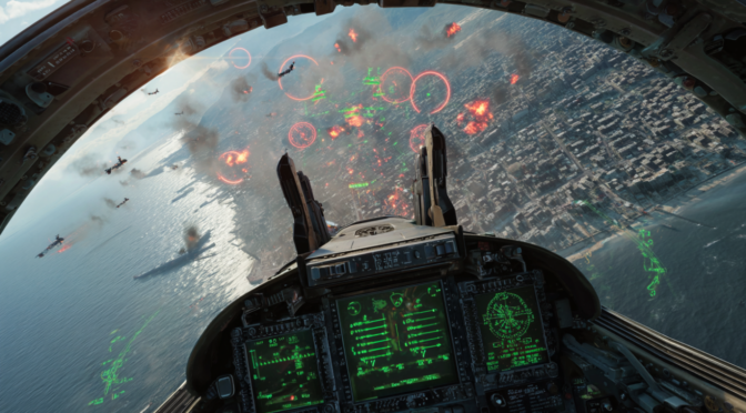 Still, he’s got an idea, a bold one like he’s John-freakin’ Wayne. Shawn flips to GUN, kicks the rudder and with a deep breath he squeezes the trigger and holy hell, he’s splashed one! Add a little nose up pitch at the last minute, a quick 7.5g pull and he’s taken down another. It’s spiraling now, exploding into a trail of flames as he tail-slides back towards the ground below, helplessly watching as the other enemy missiles hit their marks straight into a handful of buildings.